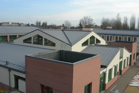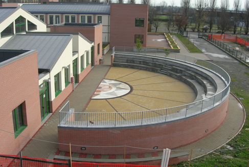 The castelfranco emilia school complex is a part of an overall urban plan intended to create an educational district, of which this project represents the final stages of implementation. The school is comprised of two, two-storey classroom buildings, a sports hall, cafeteria and an open-air theatre for students. The two classroom buildings are exactly equal in size, and are situated so that they are symmetrical to the other facilities. The total gross floor area is 4063 m2. The school complex was designed and finished over a period of five years, from 2002 to 2007. The contextual integration of the design into the existing urban and rural townscape is achieved by scaling the school complex, which is composed of many integrated blocks, to reflect that of buildings in the surrounding neighbourhood. This integration was further enhanced through the use of traditional buildings materials (red brick - white plaster) and the addition of stylistic elements typical of historical rural design