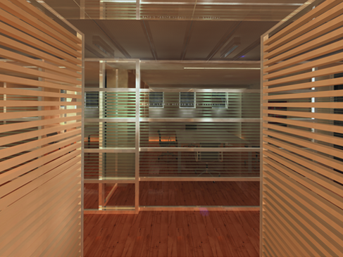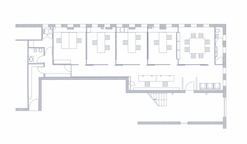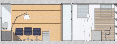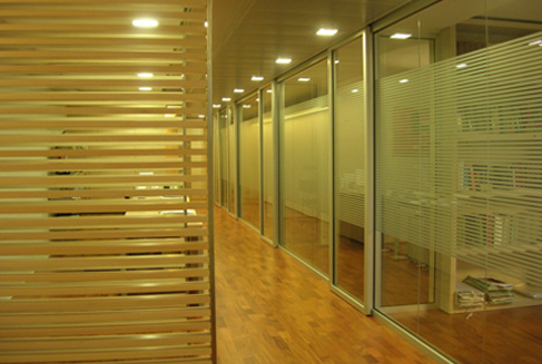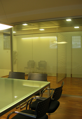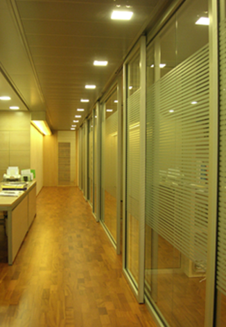 The client's, the legal firm A&C, brief was to create an office to house their headquarters by adapting a space of 155 m2 situated on the lower-ground of a larger building, and with natural light provided only by virtue of 18 small, street-facing windows. The office needed to include: 4 private offices, 1 meeting room, 1 waiting room, 1 filing room, 1 kitchenette and 2 toilets. The design solution was to position the private offices along the fenestrated exterior wall; a continuous glass wall was then added to ensure office privacy while also providing natural light to the remainder of the interior space, including the waiting room, the entrance, the reception and the corridor. The office partitions, from the exterior wall to the interior glass wall, are enclosed by glazed elements in order to further maximise the available natural light, along with visibility from the private spaces to the rest of the complex. The interior design is kept very simple and minimal to enhance both quality and functionality. The panels, the partitions, the glass sliding doors, the 'boiseries', the bookshelves, the 'transparent' doors in whitened beech, the doussie wooden floor and the acoustic metal ceiling, combine to give the space a sense of being both visually and materially light and airy.